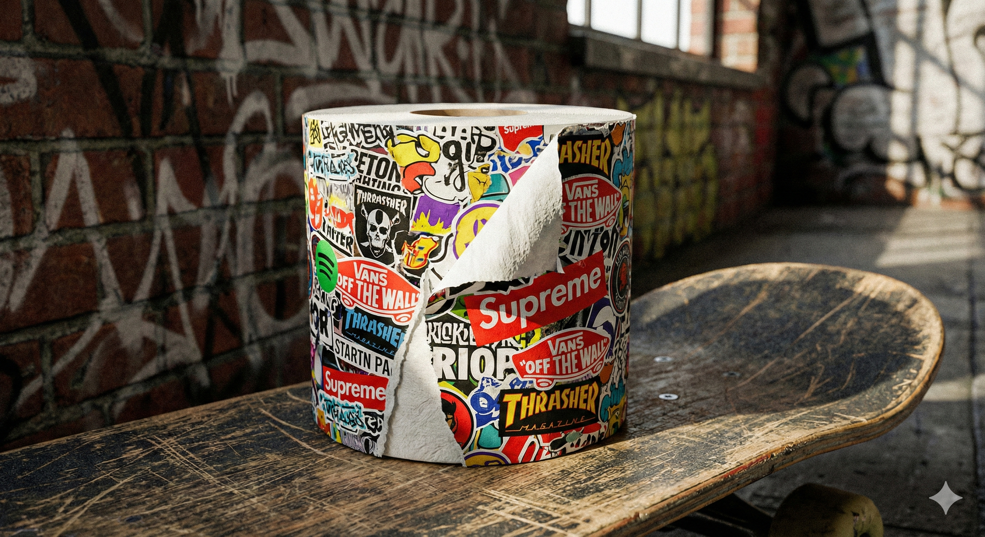 VOLLE ABDECKUNG: Hier wurde nichts ausgelassen. Jedes einzelne Blatt ist mit hunderten überlappenden Street-Art-Motiven, Skate-Logos und harten Tags bedruckt. Der Kontrast zwischen dem glänzenden Sticker-Look und der weichen Papierstruktur ist ein haptisches Erlebnis.